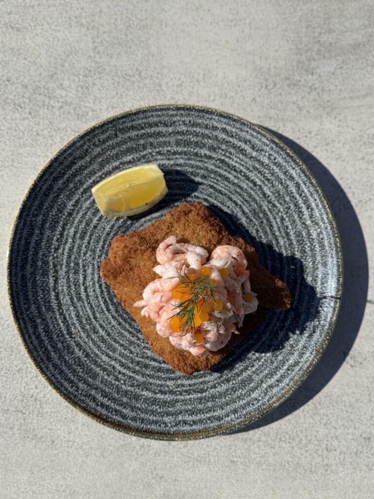 Smørstegt isingfilet, håndpillede rejer & rosapebermayo